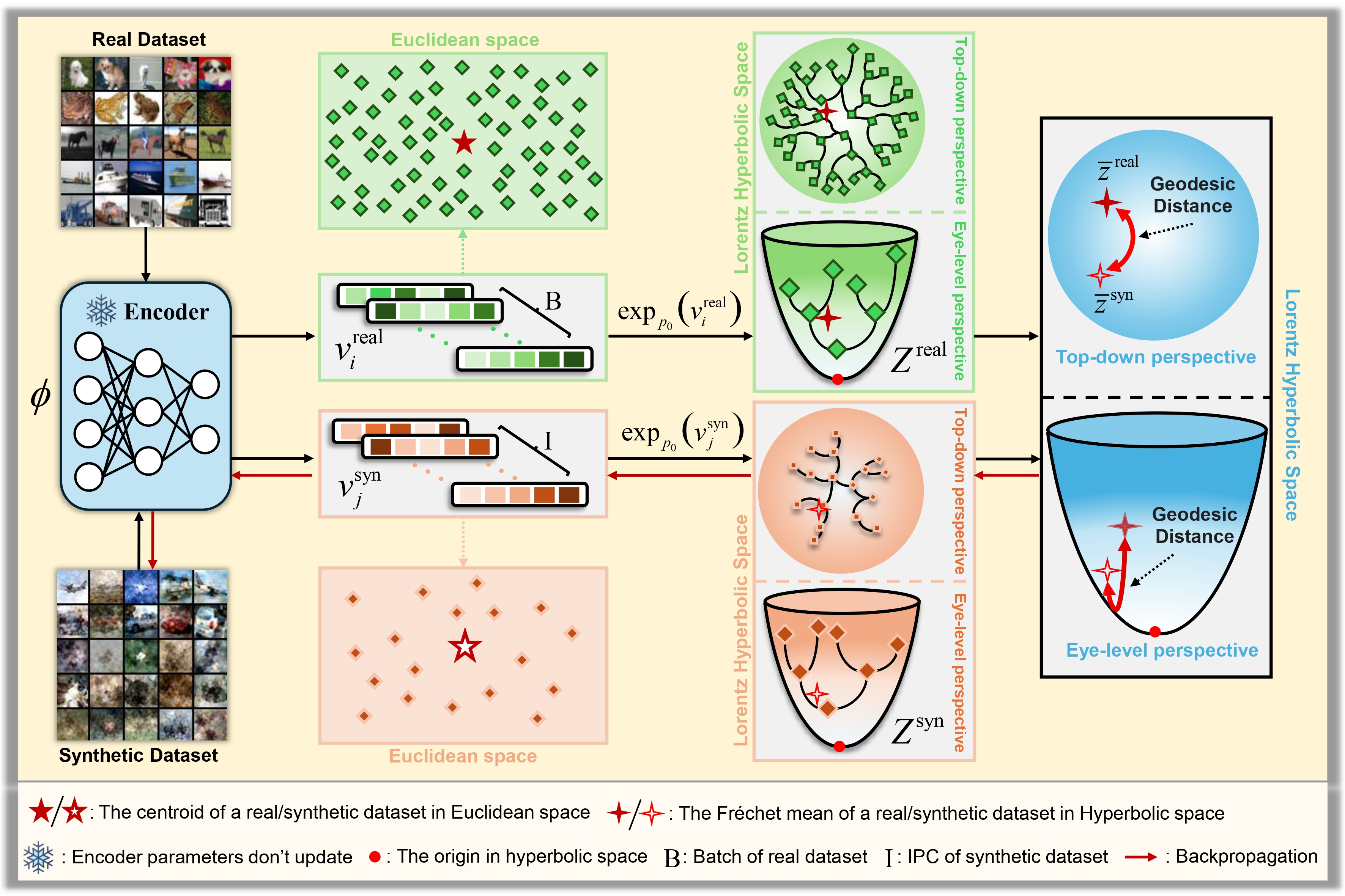 To address the computational and storage challenges posed by large-scale datasets in deep learning, dataset distillation has been proposed to synthesize a compact dataset that replaces the original while maintaining comparable model performance. Unlike optimization-based approaches that require costly bi-level optimization, distribution matching (DM) methods improve efficiency by aligning the distributions of synthetic and original data, thereby eliminating nested optimization. DM achieves high computational efficiency and has emerged as a promising solution. However, existing DM methods, constrained to Euclidean space, treat data as independent and identically distributed points, overlooking complex geometric and hierarchical relationships. To overcome this limitation, we propose a novel hyperbolic dataset distillation method, termed HDD. Hyperbolic space, characterized by negative curvature and exponential volume growth with distance, naturally models hierarchical and tree-like structures. HDD embeds features extracted by a shallow network into the Lorentz hyperbolic space, where the discrepancy between synthetic and original data is measured by the hyperbolic (geodesic) distance between their centroids. By optimizing this distance, the hierarchical structure is explicitly integrated into the distillation process, guiding synthetic samples to gravitate towards the root-centric regions of the original data distribution while preserving their underlying geometric characteristics. Furthermore, we find that pruning in hyperbolic space requires only 20% of the distilled core set to retain model performance, while significantly improving training stability. Notably, HDD is seamlessly compatible with most existing DM methods, and extensive experiments on different datasets validate its effectiveness.
